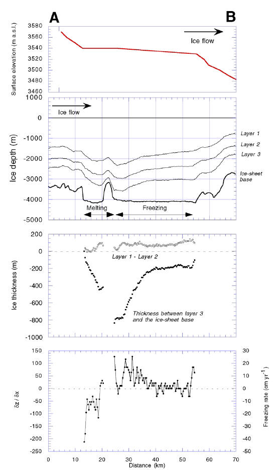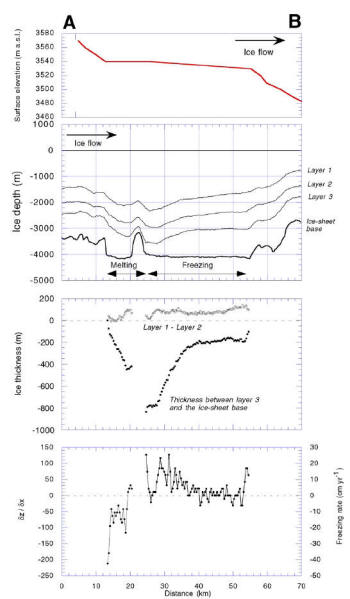 ice sheet consists of a layer of 227 m of disrupted ice, 70 m of ice