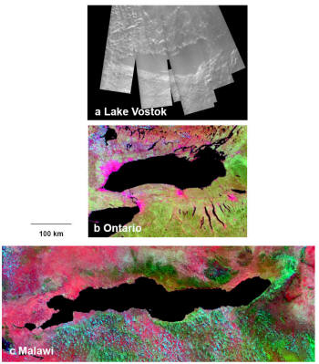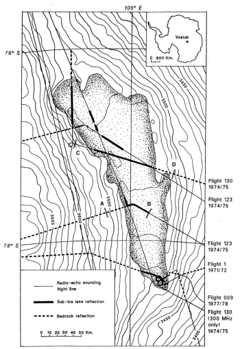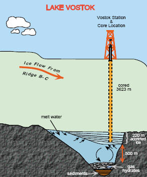over Lake Vostok. The upper 70 m of this large crystal ice includes