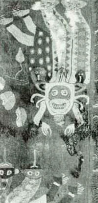 Un fragmento de una de las preciosas mantas policromas de Paracas,