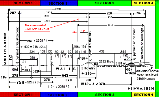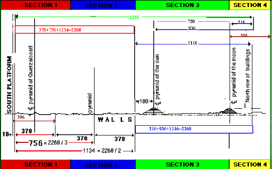 Los aztecas pensaron que la construyeron los dioses, y yo os explique como la construirían los hombres. Os he dicho que mataron dos pájaros de un tiro con las paralelas. No solo sucede con ellas, hay muchas formas de obtener 2268 a ambos extremos de un sector de 2250, solo una de que una de sus dos mitades sea 378+378+378, además si calculáis los valores de los extremos en el ancho 2268 veréis que son 8,5*378 y 9,5 por 378, se diferencian en un ciclo de saturno. Si comprendisteis todo lo que os explique también seréis capaces de sacar vuestras propias conclusiones.