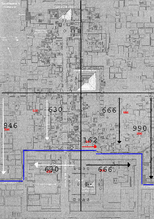 Por el momento sabemos que los días están medidos en esta ciudad. De uno a otro extremo, hay 1314000 y 1366560 días. Ahora hay que situar dentro de esta “matriz cuadrada” todos sus puntos importantes, es decir, el resto de muros, de pirámides, de centros ceremoniales… como si fueran chinchetas que marcan zonas en un mapa, aunque en este caso lo que marcan esas chinchetas son días en concreto con un margen de error de posiblemente 24 años, y con estas medidas hacer predicciones aunque tras la perdida de Jesús Alberto no se si alguno del grupo tendrá las cualidades para hacerlo.