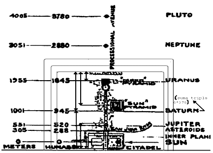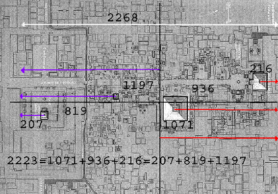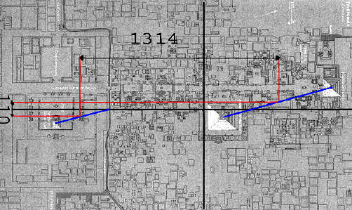 Los extremos, que son la torreta central de la ciudadela y la columna central de la plaza de las tres columnas, son los que (al igual que las medidas reales norte sur se definían en el ancho 2268) definen en ese ancho de 585 (Venus) las medidas reales este oeste.