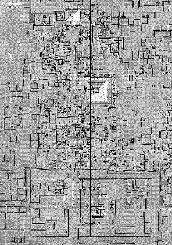 -2º propiedad: Igualdad de la distancia de la pirámide de la luna al extremo oeste de la ciudad con la distancia del templo de Quetzalcoatl al extremo este de la ciudad.