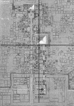 Este es el paso donde ya quedan fijados los ejes de la ciudad. ¿Qué significan los ejes? Si os hablé en el primer paso de función de distribución a partir de tres puntos, ahora, al hablar de los ejes, os hablo de dos líneas de regresión (instrumento de estadística donde la suma de distancias de todos los puntos a un lado de dichas líneas es igual a la suma de distancias de todos los puntos al otro lado) donde los valores, por lo tanto, son cero. Como veréis, dichos ejes encajan perfectamente en la estructura de la ciudad, de hecho, desviarán el río de san Juan a partir de los mismos.