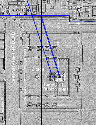Al igual que la pirámide del Sol se desplazaba 9 hunabs en el este oeste y la pirámide de la Luna se desplazaba 9 hunabs en el norte sur, al templo de Quetzalcoatl se desplaza 9 hunabs en el suelo cielo. (Ya podemos intuir donde gobierna cada pirámide)