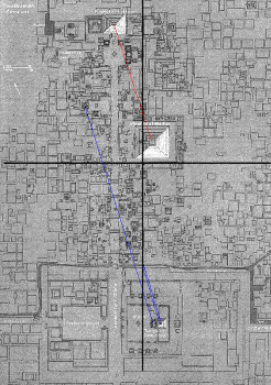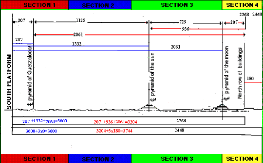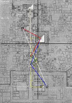 De todos estos temas se podría hablar dada las propiedades de este sistema en Teotihuacan. Sin más demora continuaré con las medidas de la ciudad separándolas en segmentos que se cortan en cada una de las tres pirámides de este complejo arquitectónico.