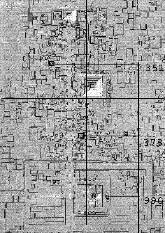 La opinión de los investigadores y arqueólogos a los que les he expuesto la situación, es que en Teotihuacan ya no se deja tomar medidas, política de conservación y explotación de sus “vacas sagradas”, por lo visto, bastante común. Por mi parte, puedo decir que dichos responsables han dividido la ciudad en cuadrantes de 57metros, pero, a parte de que considero que esa división no es tan acertada, no mencionan que se tratan de 54hunabs (medida del investigador en el que me baso). Lo que me hace pensar, por un lado, si se podría tratar de los “9 hatos de 3 cañas verdes cada uno” del mito de los cinco soles cuando hace referencia a Teotihuacan, y por otro lado, si se tratará de un plagio, para colmo, mal hecho.