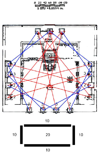 Además teniendo en cuenta la lógica constructiva de la ciudad, y que los valores de los extremos son dos y dos iguales, si la pirámide de la luna tiene una plataforma delante, la pirámide del sol o el templo de Quetzalcoatl debería tener una plataforma de iguales dimensiones para mantener la correspondencia entre las dimensiones. Ya sabéis que además de la altura, el templo es la pirámide del 20 por esas líneas.