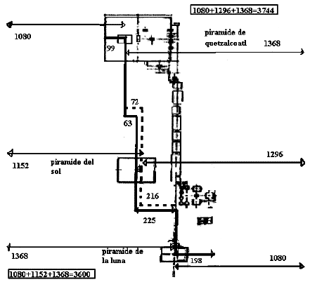 Aquí se hace mención al sistema que descubrí de suma de distancias a las tres pirámides, ¿Por qué se le adjudica al constructor de la pirámide de la luna? Todos los que hemos medido Teotihuacan sabemos la importancia de la calzada de los muertos (prolongación de la pirámide de la luna) para poder tomar medidas a partir de ella. Hugh Harleston se dio cuenta que la mayoría de medidas eran múltiplos de nueve (los nueve hatos) pero nunca se le ocurrió sumar las distancias a las tres pirámides al mismo tiempo y no solo a una (las tres cañas verdes).