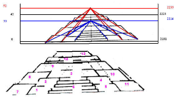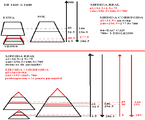 Intentos para arrojarse al fuego. Dicha pirámide divide su altura en 4, 18+18+18+18, y el eje y segundo pasillo frontal corta un cuarto de la base. Posteriormente me he enterado de que mucha gente piensa que se reconstruyo mal dicha pirámide y que en vez de 5 o 6 niveles, originalmente era de cuatro.