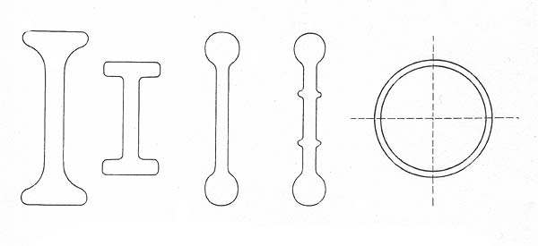| Figure 14a Schematic drawing of a few if the many forms of the bolts, vestiges of which are found in the shape of depressions in the blocks supported in ancient times by these clamps or couplings which were used between them. |