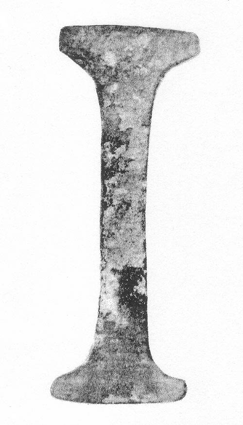 | Figure 14 A bronze bolt (clamp) in half size. With these devices, which also came in large sizes, they joined the carved blocks in the surfaces of which there had previously been made depressions in the form and size of the bolt. |