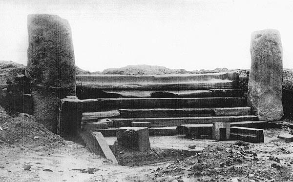 | Figure 23 The great perron which gives access to the Sun Temple of Kalasasaya. It was covered until the year 1903 by alluvial earth which was removed by the Crequi de Montfort Comission. It is not located at the center of the building but is moved to the north 1.116m. for the reason set forth in illustration No. 19. At its foot there is still to be noted an elegant pavement which was later torn away by the aforementioned iconoclasts. |