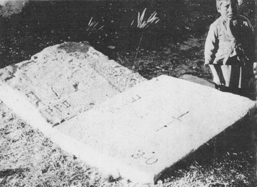 | Figure 26 The observation stone of the Third Period of the priests and astronomers of Tihuanacu. It is located in the highest part of the Sun Temple and was planned as a base or foundation for a lower structure which in turn was to support above as a central block of the Sun Temple the famous door, today called the Sun Door of Tihuanacu. |