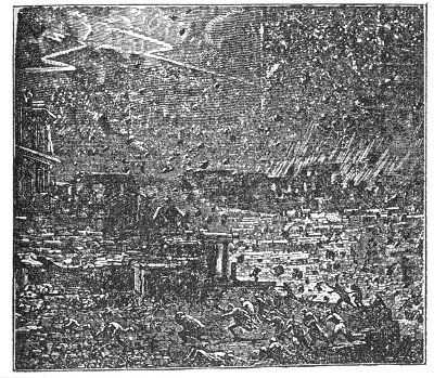 In April, 1815, one of the most frightful eruptions recorded in history occurred in the province of Tomboro, in the island of Sumbawa, about two hundred miles from the eastern extremity of Java. It lasted from April 5th to July of that year; but was most violent on the 11th and 12th of July. The sound of the explosions was heard for nearly one thousand miles. Out of a population of 12,000, in the province of Tombora, only twenty-six individuals escaped. "Violent whirlwinds carried up men, horses, and cattle into the air, tore tip the largest trees by the roots, and covered the whole sea with floating timber." (Raffles's "History of Java," vol. i., p. 28.) The ashes darkened the air; "the floating cinders to the westward of Sumatra formed, on the 12th of April, a mass two feet thick and several miles in extent, through which ships with difficulty forced their way." The darkness in daytime was more profound than the blackest night. "The town called Tomboro, on the west side of Sumbawa, was overflowed by the sea, which encroached upon the shore, so that the water remained