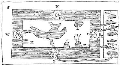 such as here on the eastern edge is described, where it received our first parents, driven out of Paradise to that extreme point of land on the sea-shore. Hence, upon the coming of the Deluge, Noah and his sons were borne by the ark to the earth we now inhabit. The four rivers he supposes to be gushing up the spouts of Paradise." They are depicted on the above map: O is the Mediterranean Sea; P, the Arabian Gulf; L, the Caspian Sea; Q, the Tigris; M, the river Pison; "and J, the land where men dwelt before the Flood."