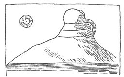 The following rude cut, from Cosmos, represents the high mountain in the north behind which the sun hid himself at night, thus producing the alternations of day and night. His solar majesty is just getting behind the mountain, while Luna looks calmly on at the operation. The mountain is as crooked as Culhuacan, the crooked mountain of Atzlan described by the Aztecs.
