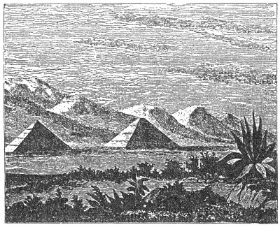 In Mexico pyramids were found everywhere. Cortez, in a letter to Charles V., states that he counted four hundred of them at Cholula. Their temples were on those "high-places." The most ancient pyramids in Mexico are at Teotihuacan, eight leagues from the city of Mexico; the two largest were dedicated to the sun and moon respectively, each built of cut stone, with a level area at the summit, and four stages leading up to it. The larger one is 680 feet square at the base, about 200 feet high, and covers an area of eleven acres. The Pyramid of Cholula, measured by Humboldt, is 160 feet high, 1400 feet square at the base, and covers forty five acres! The great pyramid of Egypt, Cheops, is 746 feet square, 450 feet high, and covers between twelve and thirteen acres. So that it appears that the base of the Teotihuacan structure is nearly as large as that of Cheops, while that of Cholula covers nearly four times as much space. The Cheops pyramid, however, exceeds very much in height both the American structures.