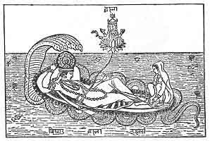 The god Vishnu supported by the Serpent Ananta, having seven heads, the symbol of the Seven Commands of Creation.">