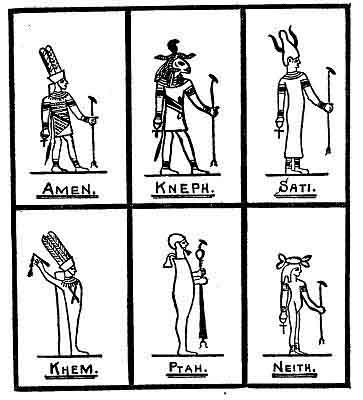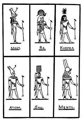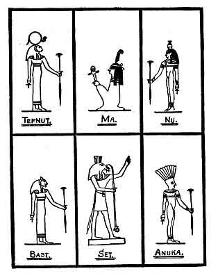 THE EGYPTIAN PANTHEON.--Many of our religious conceptions today are strong reflections of the old Egyptian. One might say indeed that our present day religion came to us from Egypt via the Jews. For that reason I have decided to give in this book an Egyptian Pantheon, which I have made up from the Egyptian Book of the Dead.