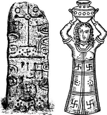 The red cross of St George (England) and the crosses of St Andrew (Scotland) and St Patrick (Ireland), and the ensigns of Scandinavia, were all carried as sacred standards of victory by the Phoenicians. The red cross was the fire cross, a Phoenician-Aryan symbol for the Sun, as was the swastika, later used by the Nazis. A swastika can be seen on a stone dedicated to the Phoenician Sun-god Bel, which was found at Craig-Narget in Scotland and was used to decorate the robes of their high priestesses (see Figures 10 and 11). Figure 10: The swastika, the Phoenician sun symbol, on the Phoenician Craig-Narget stone in Scotland and,