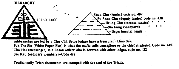 This article will primarily deal with the Triads which have so many other names it would take pages upon pages to give them all. One of the names the Triads have had is the Heaven and Earth Society. Other principal names include the Hung League, and the Three United Association. The Freemasons have been very interested in the Triads and several Masons have done in depth studies and written books about the Thads including G. Schlegel (The Hung League. 1866), J.S.M. Ward (The Hung Society - see another quote of his on pg. 2), and W.G. Sterling (The Hung Society. 1925) (This article will be trimmed back-and perhaps some of the information can be provided in a future newsletter.) The history of China is a history of authoritarian dynasties and the secret societies that opposed them. Throughout Chinese history, there has basically been only one recourse to opposition to the establishment, that was through secret societies. Secret Societies have been a way for the powerless, to struggle against what ever they perceived as the cause of their misery.