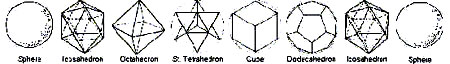 The Platonic solids The five Platonic solids hold the key to understanding the Planetary Grid system. Already we have seen that the cube and octahedron are present in Cathie’s work. Hoagland unlocked the star-tetrahedron, so now we only need to find the icosahedron and the dodecahedron. Here is a diagram of the Platonic solids in a sequence that relates to the progression of vibration, the ancient Indian theory of how they correspond to colour sequence and the notes in a ‘pure Diatonic’ scale. Therefore what they are really showing us is the dimensions we, and the Universe are slowly travelling through. We are currently in the ‘Octahedron’ or ‘Third’ dimension/density and will soon be moving into the ‘Star-Tetrahedron’ or ‘fourth’ dimension/density (Wilcock believes we already have shifted – we just haven’t let go of the third yet).