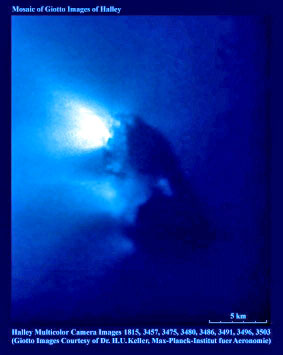 The excitement rose to fever pitch as small jets could now be seen and the pure white nucleus became better defined with each returning photo. At last as the pure white nucleus that Whipple knew had to lie in the center of all the dust and gas became clearly defined - Whipple screams out on international television... 'it's the nucleus... there it is... it's the nucleus!!!!'. Just then the Giotto space craft broke through the final layers of gas and dust to reveal what is now known to be the darkest, blackest object ever photographed by any space craft in the history of the space program. Silence and shock filled the direct feed television and Giotto's picture broke up. Something terrible had gone wrong. There was no snowy nucleus. What was it? and how could all the journal articles have been wrong?.