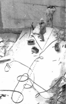 It was assembled from wooden ties and radio antenna mast sections and provided a base along which the cutting lance was moved. A wire mesh screen was fitted around the frame to protect the operator from the small pieces of flying rock which were removed by the jets during the cutting process. The cutting lance was pulled along the frame using a bicycle chain, and two small hydraulic motors were used, one to turn the nozzle assembly, and the other to draw it along the rock surface.