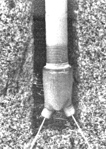 nozzle, showing the jets at low pressure. These jets are spun, at a speed of 180 rpm and the whole cutting assembly moves over the rock at a speed of 10 ft/min. As the jets hit the rock, they cut a slot between a quarter and a half inch deep and two inches wide. The cutting lance is then lowered this amount, and moved back over the slot. A frame was erected at the Rock Mechanics and Explosives Research Center to cut the rock.