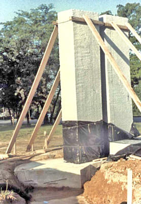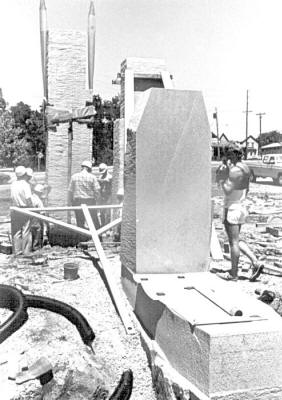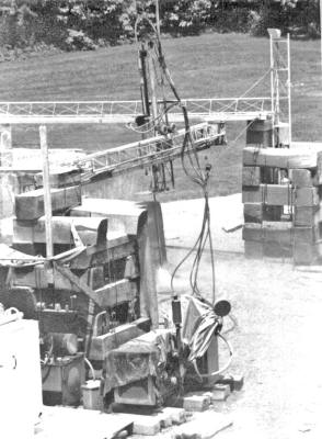 crane and straps to position one of the Trilithons. It took over four hours to get each rock accurately aligned. The great trilithon ring is set on an 18 in. thick concrete pad and each rock was set on this. Straps were tied around the center of each stone to lower them into place, and they were then held in position using wooden braces until they could be accurately aligned and set in the concrete.