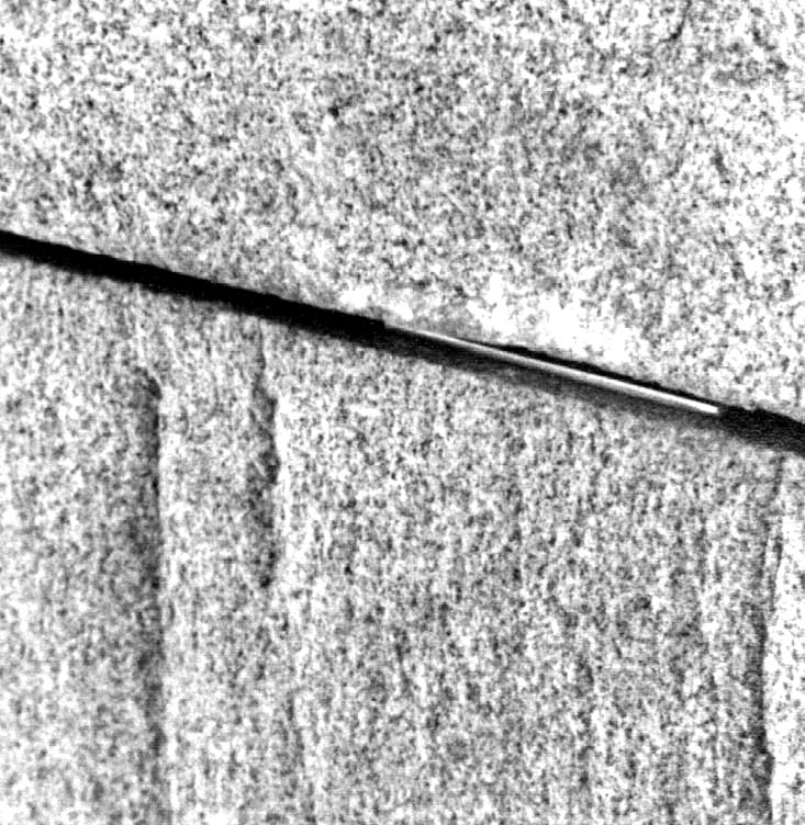 the block alignment with a wedge. For the analemma stones where accuracy is critical, the rock angle was first measured, (it was 89.5 deg) and to ensure accuracy, 3 pins were set between the two rocks, while a shim 1/16 in. thick was placed under the back of the upright stone.