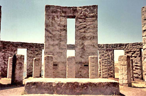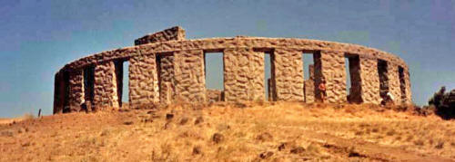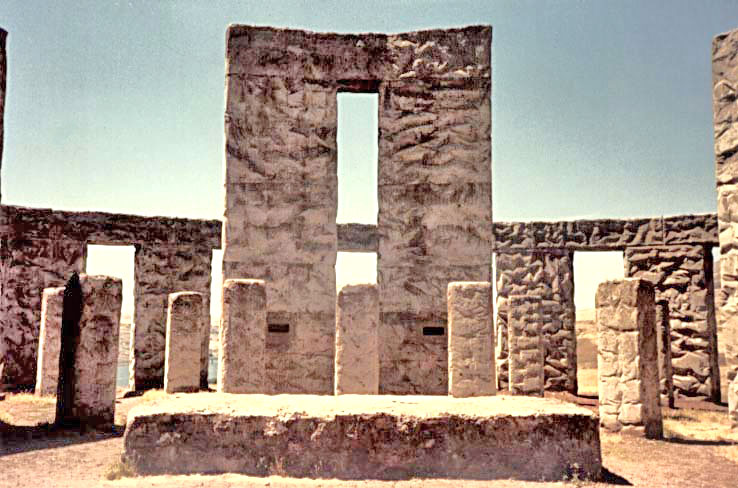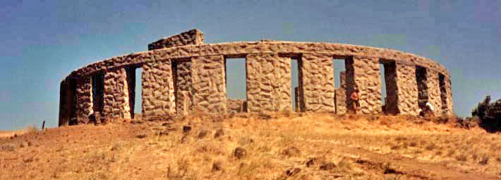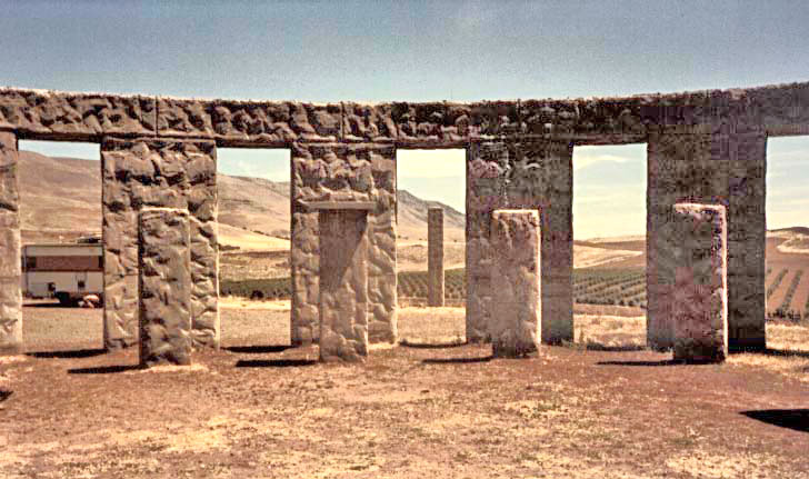 Stonehenge at Maryhill, in Washington State. The monument is not an exact replica, because of the problems which arose with the local hills and the presence of the river gorge. Thus, the hills block the midsummer sunrise over the heel stone, which is considerably smaller and closer to the circles than at the original.