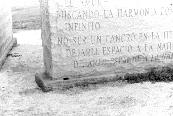 a Guidestone showing the Spanish language, and the mounting. The Gnomen, or Center Stone, has a small window through its center which is aligned with the Pole Star. This alignment changes over the years, so that the star will not always be in the center of the view. This is unlike the UMR Polar window, which was made large enough to retain the star position for the next 4,000 years.