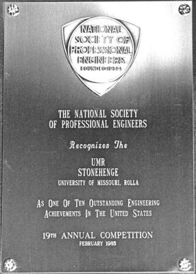 It was in this form that the University received an award for one of the Ten Outstanding Engineering Achievements of the National Society of Professional Engineers. That year other awards included the Chicago Sewer System, and the Hubble Telescope. Figure 37. Plaque awarded to UMR for this sculpture.