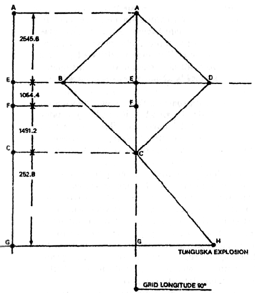 G = Intersection of grid longitude 90° of Tunguska explosion 60°