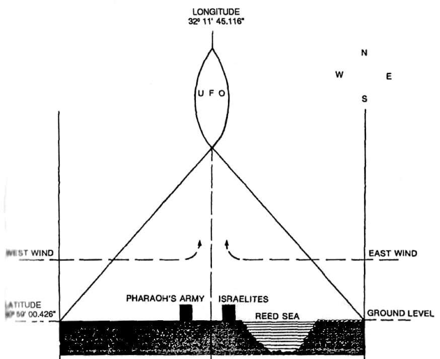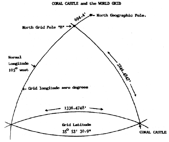 E = Pole of UFO grid. F = North geographic pole.