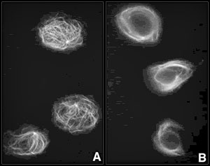 Imágenes de microtúbulos, en las distintas etapas de mitosis celular. |