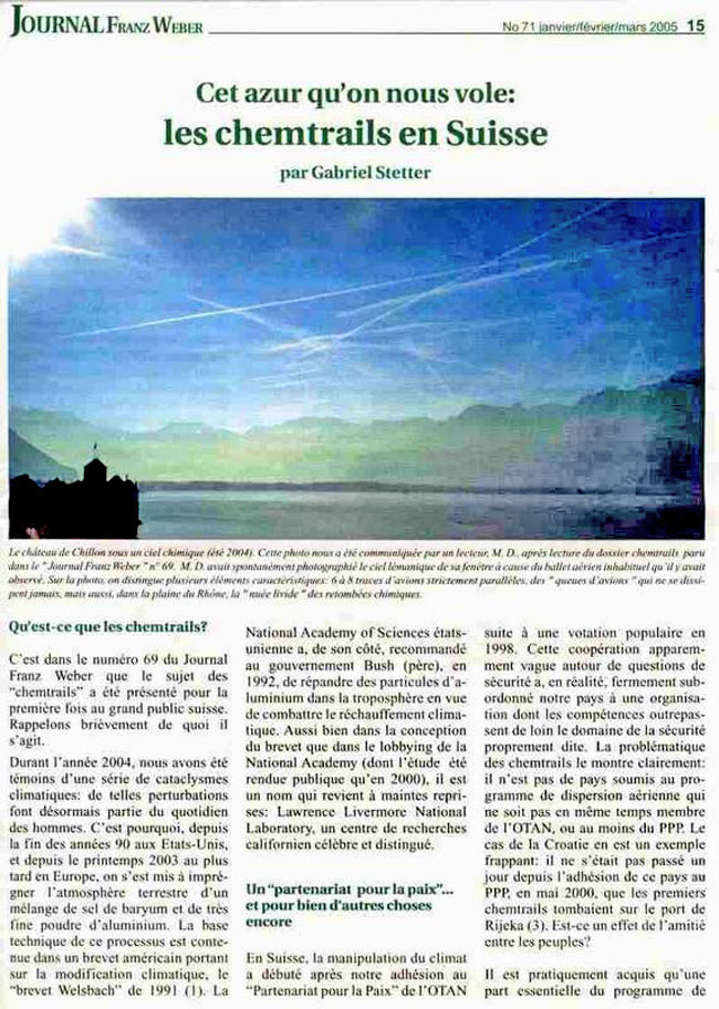 “At last!” announced a German science magazine. “There we have it. In the skies of Germany, Social Democratic member of Parliament Monika Griefahn tells us, aluminum and barium compounds are being spread just as tens of thousands of concerned citizens have observed, documented and bitterly deplored... But the public outcry in Europe will have to spread to North America if we are to stop this massive, illegal and continuing air and atmospheric pollution."