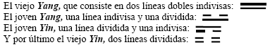 Hemos tratado de delinear el sistema en el cual se basa el Libro de las Mutaciones. Vimos que todo el orden en que se mueven el mundo y la vida ha encontrado su reflejo en dos líneas cargadas de contenido espiritual, que representan la encarnación de la mutación en giro y de los dos polos que la determinan. Debemos concebir esta representación como algo muy concreto. Hoy tendemos a hablar de símbolos en este contexto, en que cada uno puede agrandar a voluntad, según su temperamento y sus sentimientos, la distancia entre los símbolos y lo simbolizado.