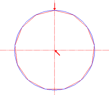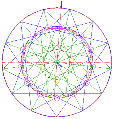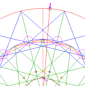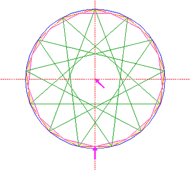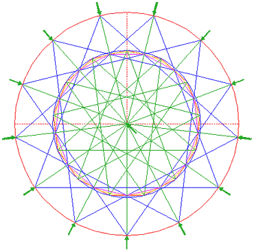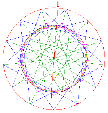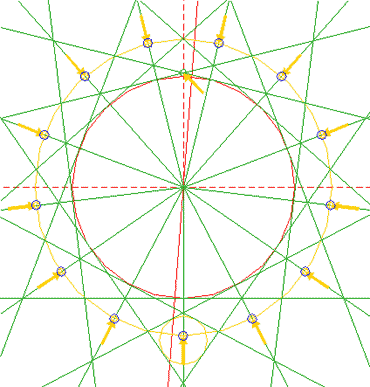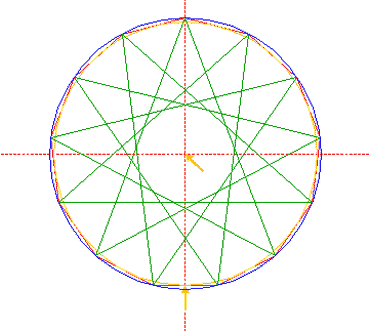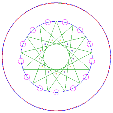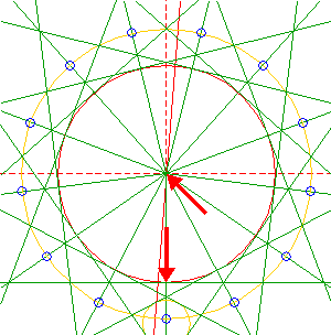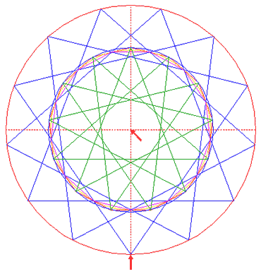 Construct the inscribed 13-sided regular polygon of circle 1, pointing up. (Note, that this polygon can not be constructed by using ruler-and-compass construction methods. The co-ordinates of its angular points must be calculated).