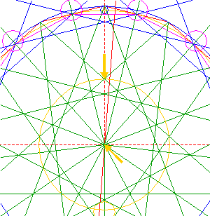 Taking as its center the upper intersection of the set of intersections of the diagonals forming star 3 closest to the center of circle 1, construct a small circle, tangent to circle 17 at the near side. See figure. |