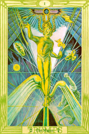 From the above it will appear that this card is the second emanation from the Crown, and therefore, in a sense, the adult form of the first emanation, the Fool, whose letter is Aleph, the Unity. These ideas are so subtle and so tenuous, on these exalted planes of thought, that definition is impossible. It is not even desirable, because it is the nature of these ideas to flow one into the other. One cannot do more than say that any given hieroglyph represents a slight insistence upon some particular form of a pantomorphous idea. In this card, the emphasis is upon the creative and dualistic character of the path of Beth.