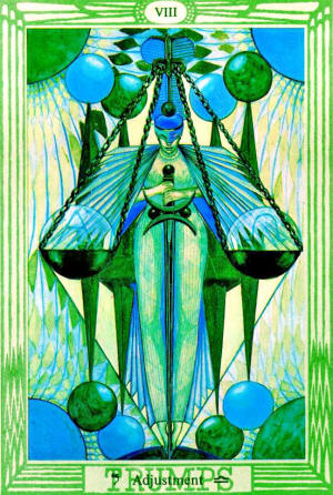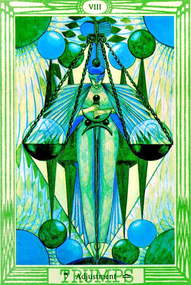 This card represents the sign of Libra, ruled by Venus; in it Saturn is exalted. The equilibrium of all things is hereby symbolized. It is the final adjustment in the formula of Tetragrammaton, when the daughter, redeemed by her marriage with the Son, is thereby set up on the throne of the mother; thus, finally, she “awakens the Eld of the All-Father.”