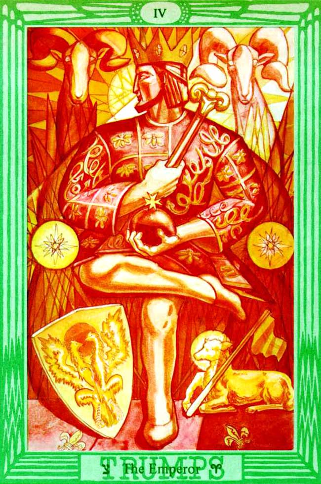 The highest symbolism of this card is, therefore, Fertility in its most exalted sense, and this is reflected in the attribution of the card to the sign of Virgo, which is another aspect of the same quality. Virgo is an earthy sign, and is referred especially to Corn, so that the background of the card is a field of wheat.