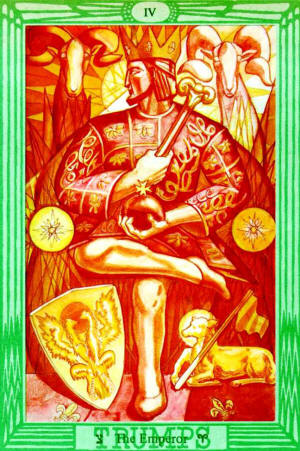 But the Sign of the Enterer is also the Sign of Benediction and of Consecration; thus his action in this card is the Celebration of the Hermetic Marriage. Behind him are the figures of Eve, Lilith and Cupid. This symbolism has been incorporated in order to preserve in some measure the original form of the card, and to show its derivation, its heirship, its continuity with the past. On the quiver of Cupid is inscribed the word Thelema, which is the Word of the Law. (See Liber AL, chap. I, verse 39.) His shafts are quanta of Will. It is thus shown that this fundamental formula of magical working, analysis and synthesis, persists through the Aeons.