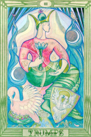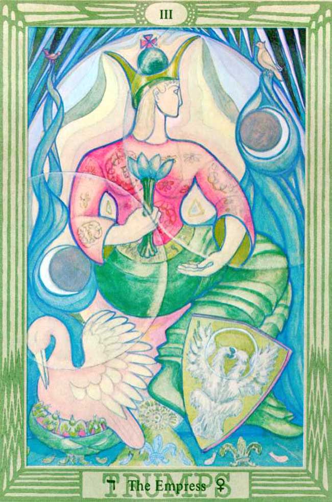 This card is attributed to the letter Daleth, which means a door, and it refers to the planet Venus. This card is, on the face of it, the complement of The Emperor; but her attributions are much more universal.