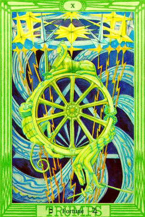This card thus represents the Universe in its aspect as a continual change of state. Above, the firmament of stars. These appear distorted in shape, although they are balanced, some being brilliant and some dark. From them, through the firmament, issue lightnings; they churn it into a mass of blue and violet plumes. In the midst of all this is suspended a wheel of ten spokes, according to the number of the Sephiroth, and of the sphere of Malkuth, indicating governance of physical affairs.