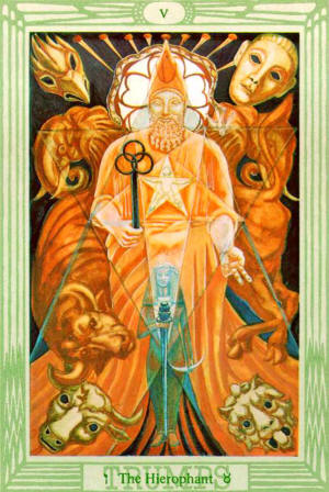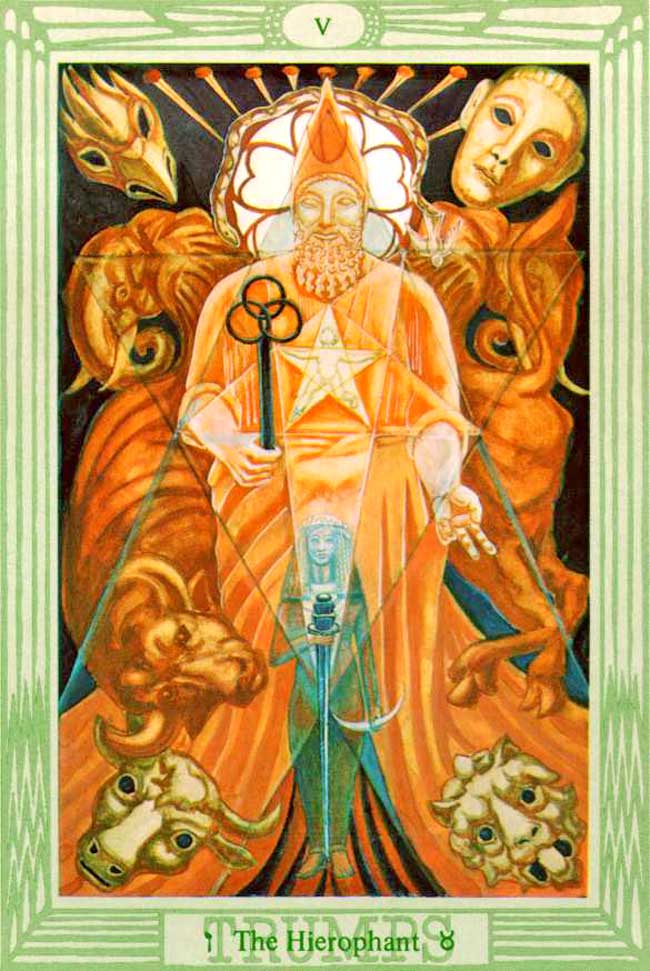 It is the aeon of Horus, of the Child. Though the face of the Hierophant appears benignant and smiling, and the child himself seems glad with wanton innocence, it is hard to deny that in the expression of the initiator is something mysterious, even sinister. He seems to be enjoying a very secret joke at somebody’s expense. There is a distinctly sadistic aspect to this card; not unnaturally, since it derives from the Legend of Pasiphae, the prototype of all the legends of Bull-gods. These still persist in such religions as Shaivism, and (after multiple degradations) in Christianity itself.