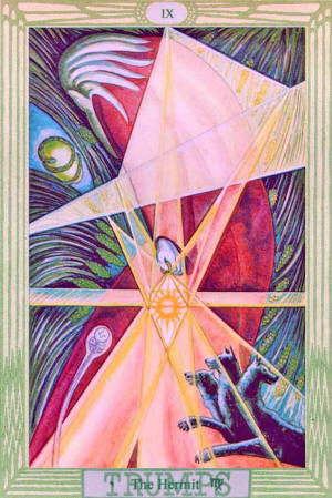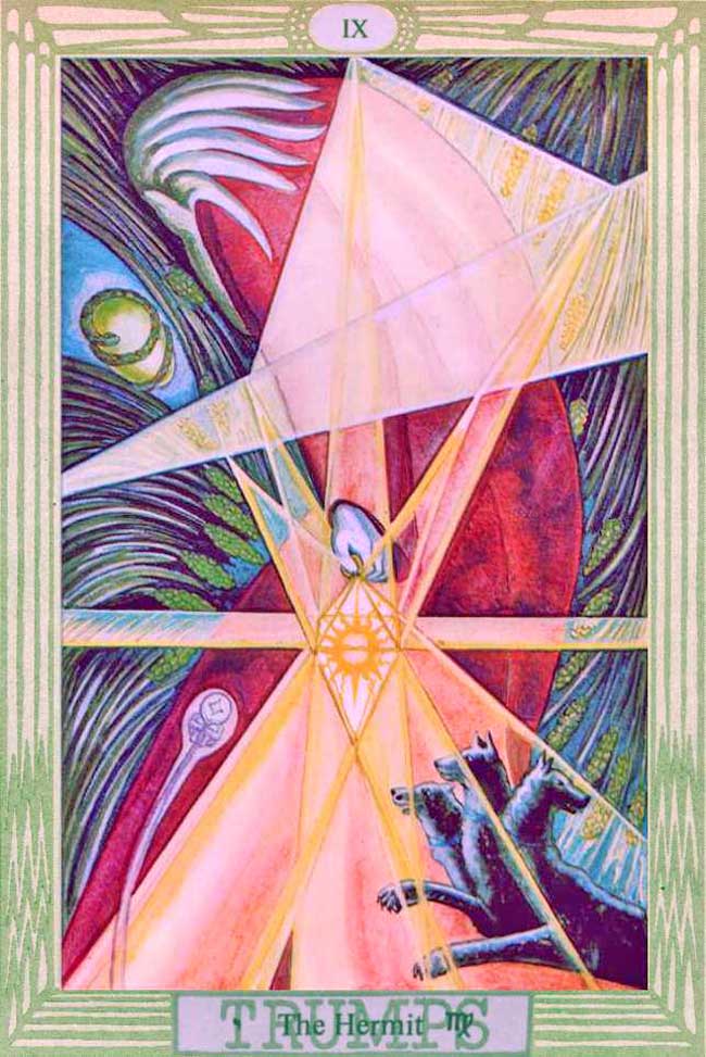 The figure of the Hermit himself recalls the shape of the letter Yod, and the colour of his cloak is the colour of Binah, in whom he gestates. In his hand he holds a Lamp whose centre is the Sun, portrayed in the likeness of the Sigil of the great King of Fire (Yod is the secret Fire). It seems that he is contemplating---in a certain sense, adoring---the Orphic egg (greenish in colour) because it is conterminous with the Universe, while the snake which surrounds it is many-coloured to signify the iridescence of Mercury. For he is not only creative, but is the fluidic essence of Light, which is the life of the Universe.